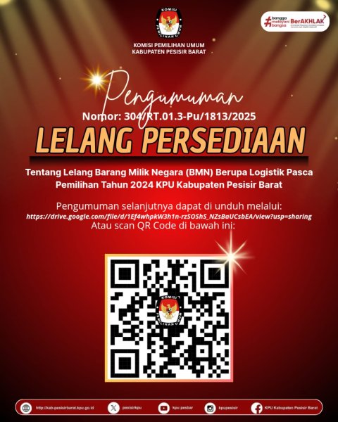 Berikut disampaikan Pengumuman Nomor: 304/RT.01.3-Pu/1813/2025 Tentang PENGUMUMAN LELANG NON EKSEKUSI BARANG MILIK NEGARA (BMN) KPU KABUPATEN PESISIR BARAT.