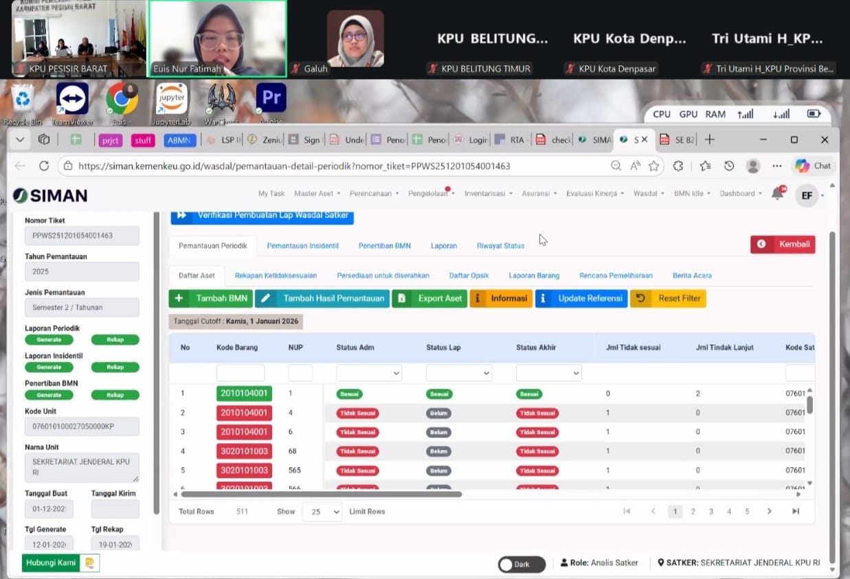 KPU Kabupaten Pesisir Barat menghadiri kegiatan Bimbingan Teknis (Bimtek) Penyusunan Laporan Pengawasan dan Pengendalian Barang Milik Negara (BMN) Semester II dan Tahunan Tahun 2025 di Lingkungan KPU yang diselenggarakan oleh KPU Republik Indonesia.