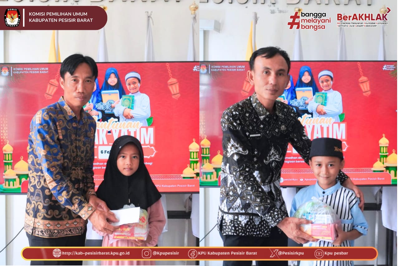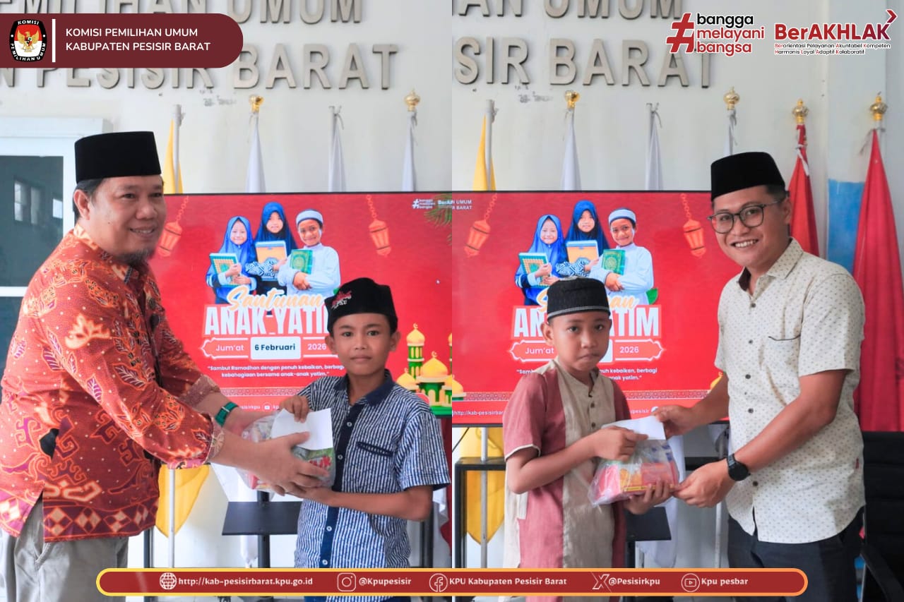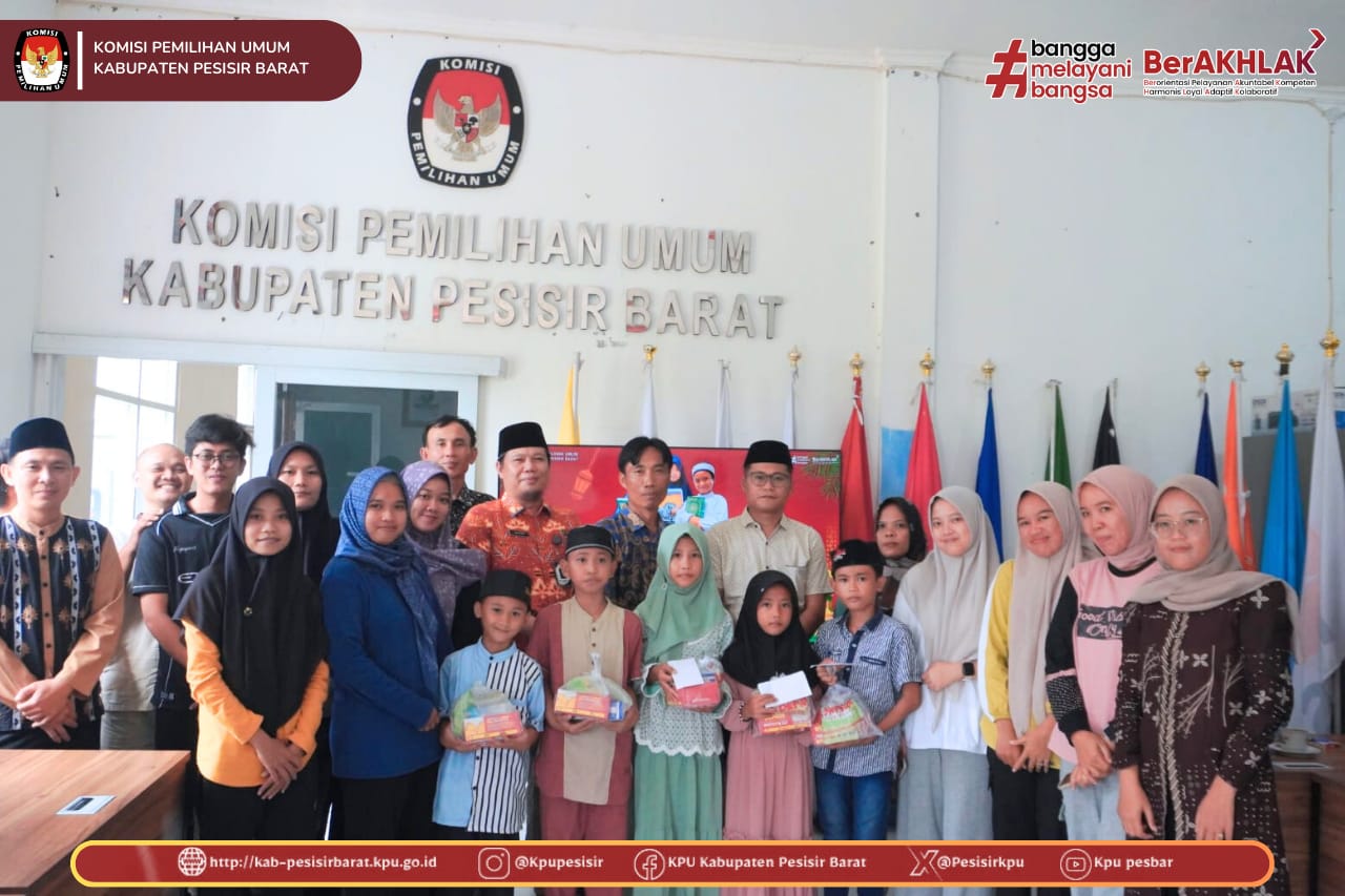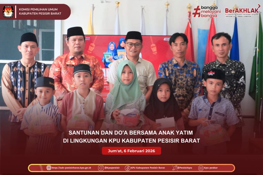 KPU Kabupaten Pesisir Barat melaksanakan kegiatan Santunan dan Do’a Bersama Anak Yatim pada Jum’at, 6 Februari 2026, bertempat di lingkungan Kantor KPU Kabupaten Pesisir Barat. Kegiatan ini dihadiri langsung oleh Ketua KPU Kabupaten Pesisir Barat, Miftah Farid, Sekretaris KPU Donny Zulkarnaen, serta seluruh jajaran sekretariat KPU Kabupaten Pesisir Barat.