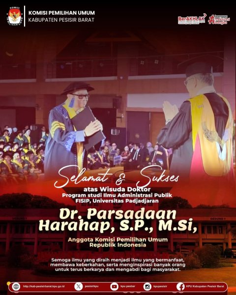 Keluarga Besar Komisi Pemilihan Umum Kabupaten Pesisir Barat mengucapkan selamat dan sukses atas Wisuda Doktor Program Studi Ilmu Administrasi Publik FISIP Universitas Padjadjaran kepada Dr. Parsadaan Harahap, S.P., M.Si., Anggota Komisi Pemilihan Umum Republik Indonesia.