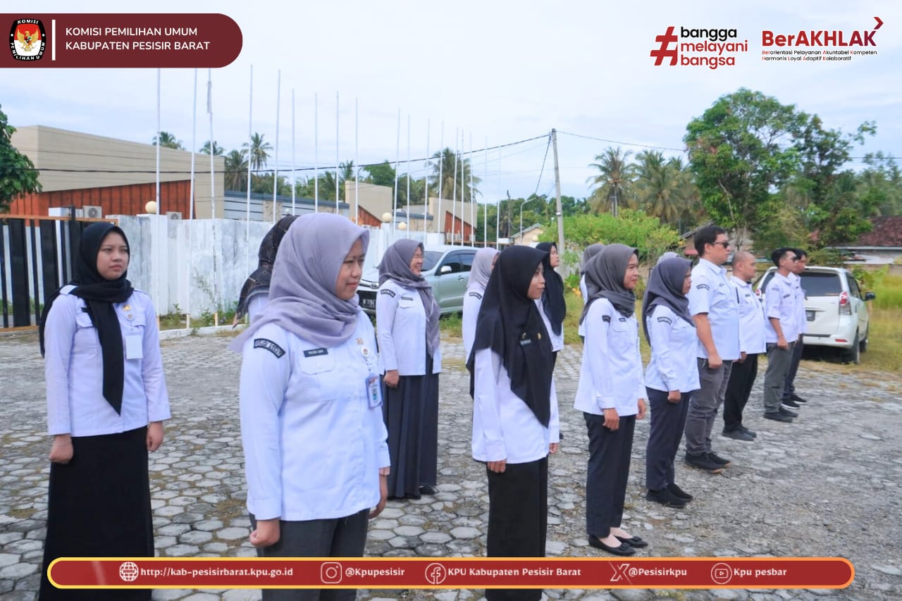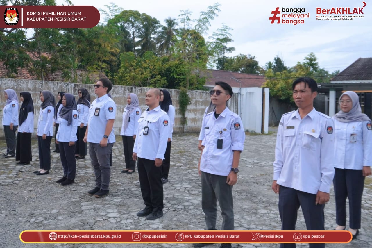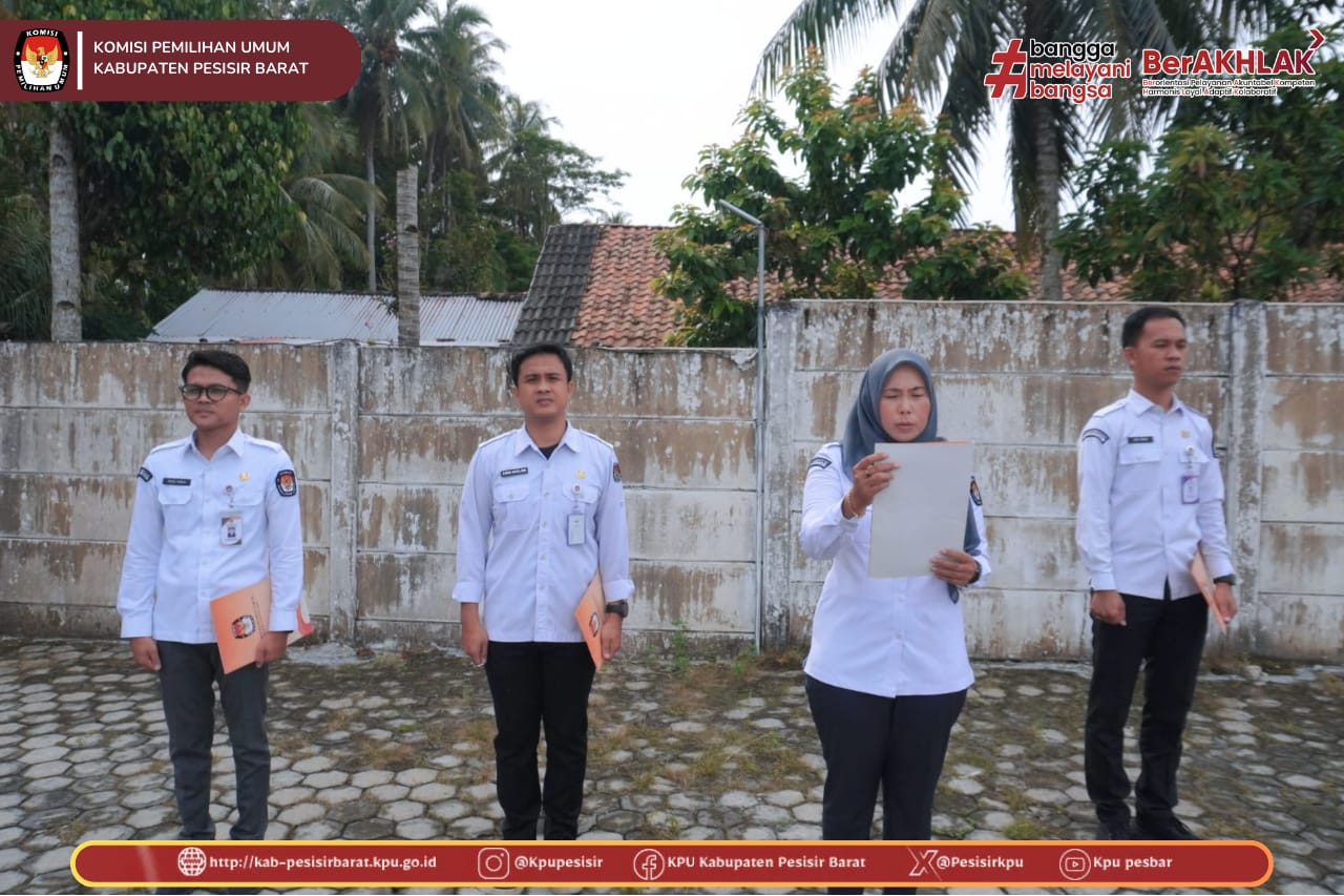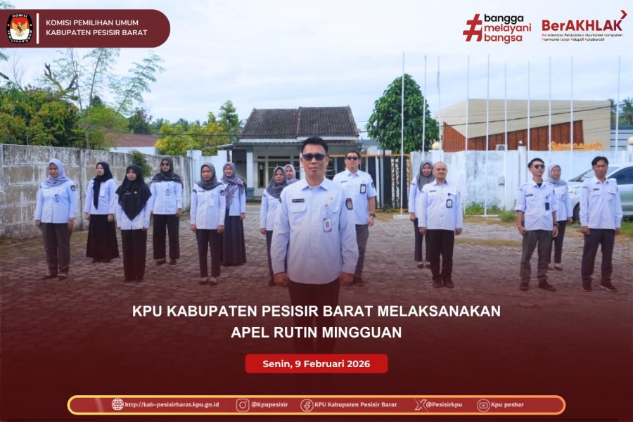 KPU Kabupaten Pesisir Barat melaksanakan Apel Rutin Mingguan pada Senin, 9 Februari 2026, bertempat di halaman Kantor KPU Kabupaten Pesisir Barat. Apel diikuti oleh jajaran sekretariat KPU Kabupaten Pesisir Barat.