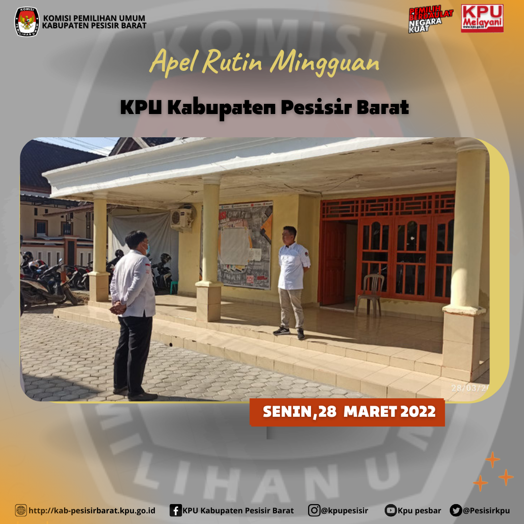KPU Kabupaten Pesisir Barat pada Senin (28/3), Melaksanakan Apel Rutin Mingguan di halaman kantor KPU Pesisir Barat di ikuti oleh Anggota dan Jajaran Sekretariat KPU Pesisir Barat. Bertindak selaku pembina apel Anggota KPU Pesisir Barat Divisi Hukum dan Pengawasan ( Azwan Feri, S. Hut ) yang dalam amanat nya mengajak seluruh jajaran KPU Pesisir Barat untuk terus meningkatkan kinerja masing-masing bagian dan selalu bekerja sama antara satu sama lain nya.