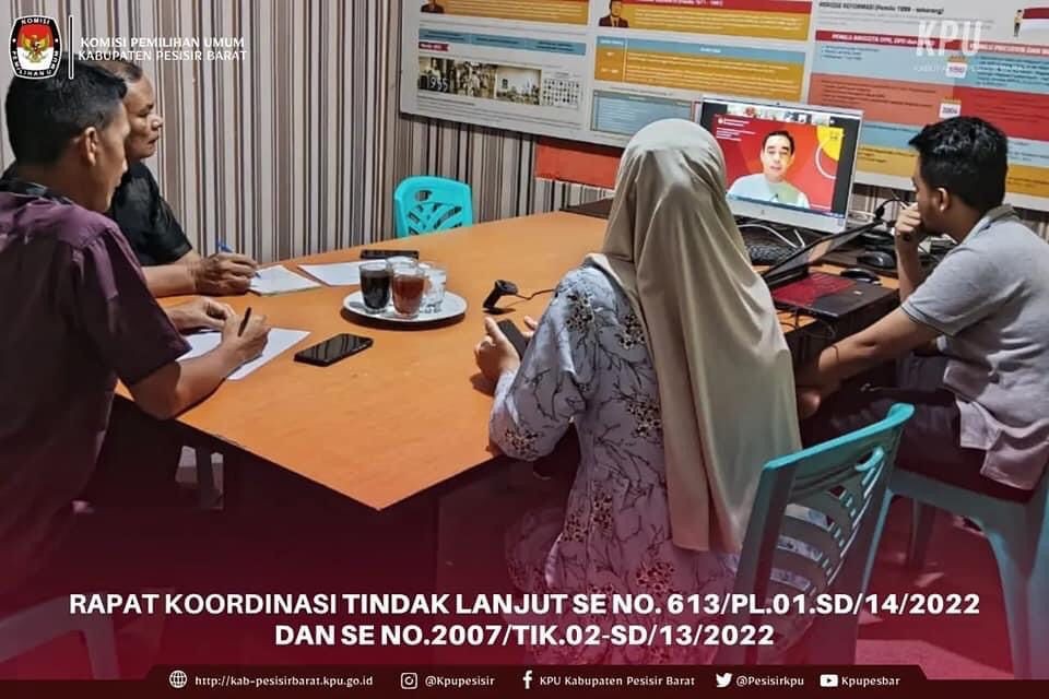 Sabtu 27 Agustus 2022,Pukul 10.00 Wib KPU Kabupaten Pesisir Barat mengikuti Kegiatan Rapat Koordinasi Tindak Lanjut SE No.613/PL.01.SD/14/2022 dan SE No.2007/TIK.02-SD/13/2022 Secara daring melalui zoom meeting di Ruang Aula Kantor KPU Kabupaten Pesisir Barat.