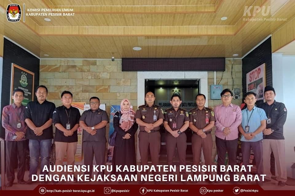 #TemanPemilih , Ketua KPU Kabupaten Pesisir Barat Marlini,SH.I,. MA bersama dengan Anggota KPU , Zairi Opani,SE, Marten Efendi,S.Kom, Azwan Feri,S.Hut dan Ramzi ,S.Pd.I beserta Sekretaris KPU Kabupaten Pesisir Barat Donny Zulkarnaen,S.Pd.I melakukan Audiensi ke Kejaksaan Negeri Lampung Barat dan diterima langsung oleh Kajari Lampung Barat Bapak Deddy Sutendy, SH,.MH . Rabu, (3/08)