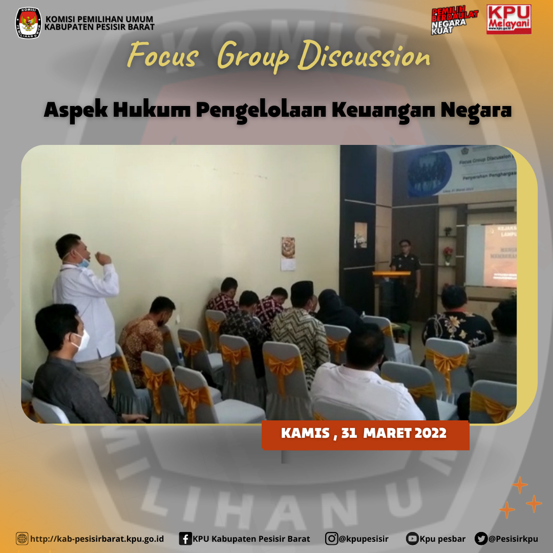 Sekretaris KPU Pesisir Barat Donny Zulkarnaen, S.Pd.I, mengikuti Focus Grup Discussion tentang Aspek Hukum Pengelolaan Keuangan Negara dengan Narasumber dari Kejari Lampung Barat, Sosialisasi Anti Korupsi dengan Narasumber KPPN Liwa. Kegiatan yang diselenggarakan oleh KPPN Liwa bertempat di Aula KPPN setempat.