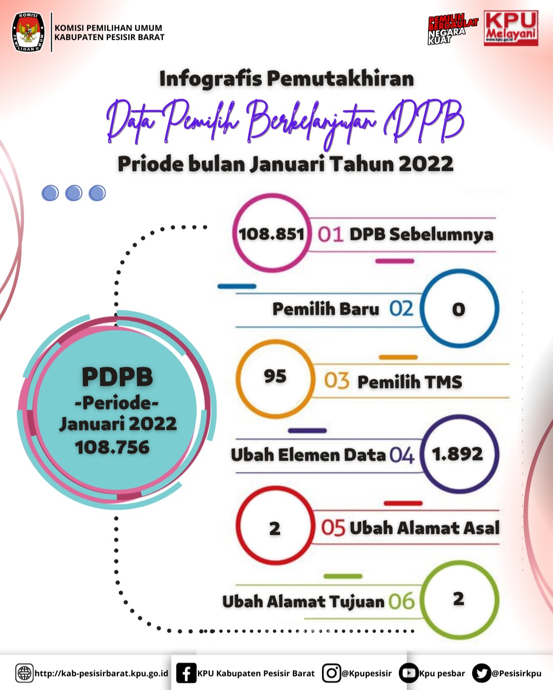 Berikut disampaikan Infografis Rekapitilasi Pemutakhiran Data Pemilih Berkelanjutan Priode bulan Januari Tahun 2022 di Kabupaten Pesisir Barat.