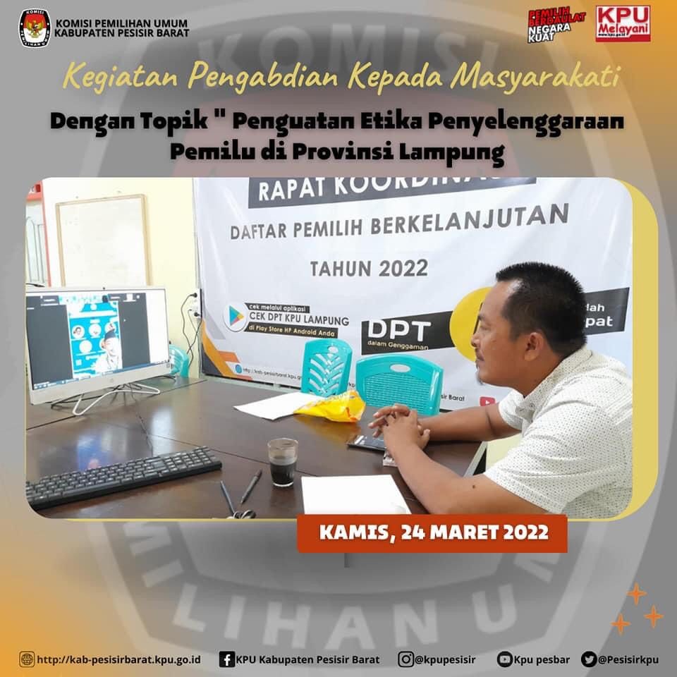 #TemanPemilih, KPU Kabupaten Pesisir Barat pada Kamis (24/03) Ketua Divisi Parmas dan SDM , Zairi Opani,SE, Ketua Divisi Hukum dan Pengawasan Azwan Feri, S.Hut dan Staf Sekretariat mengikuti Kegiatan Pengabdian Kepada Masyarakat dengan Topik “Penguatan Etika Penyelenggaraaan Pemilu di Provinsi Lampung“.