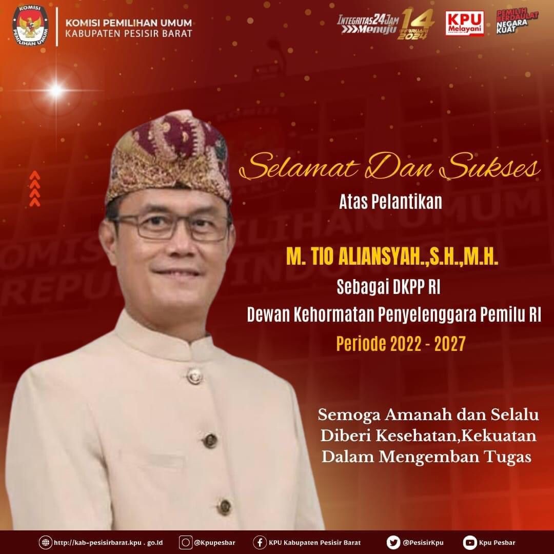 Keluarga Besar KPU Kabupaten Pesisir Barat Mengucapkan Selamat dan Sukses Atas Dilantiknya Anggota KPU Provinsi Lampung, M Tio Aliansyah.,S.H.M.H sebagai Anggota DKPP RI Periode 2022-2027