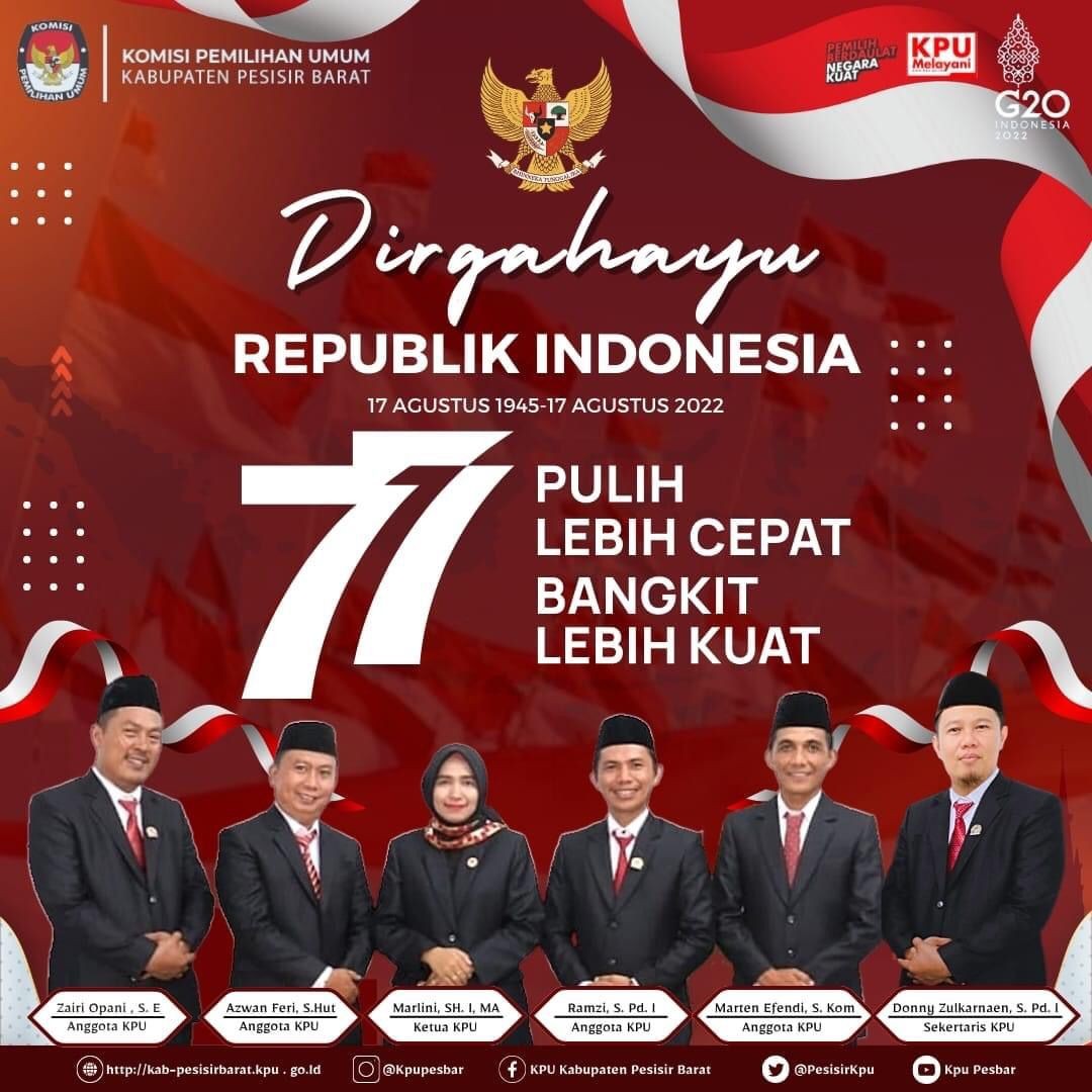 #TemanPemilih Keluarga Besar KPU Kabupaten Pesisir mengucapkan Dirgahayu Republik Indonesia ke-77, 17 Agustus 1945-17 Agustus 2022