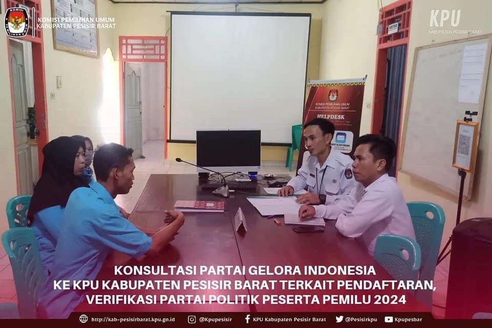 KPU Kabupaten Pesisir Barat menerima Konsultasi dari Pengurus Partai Gelora Indonesia yang berlangsung di ruang helpdesk KPU Kabupaten Pesisir Barat , Senin(15/08).