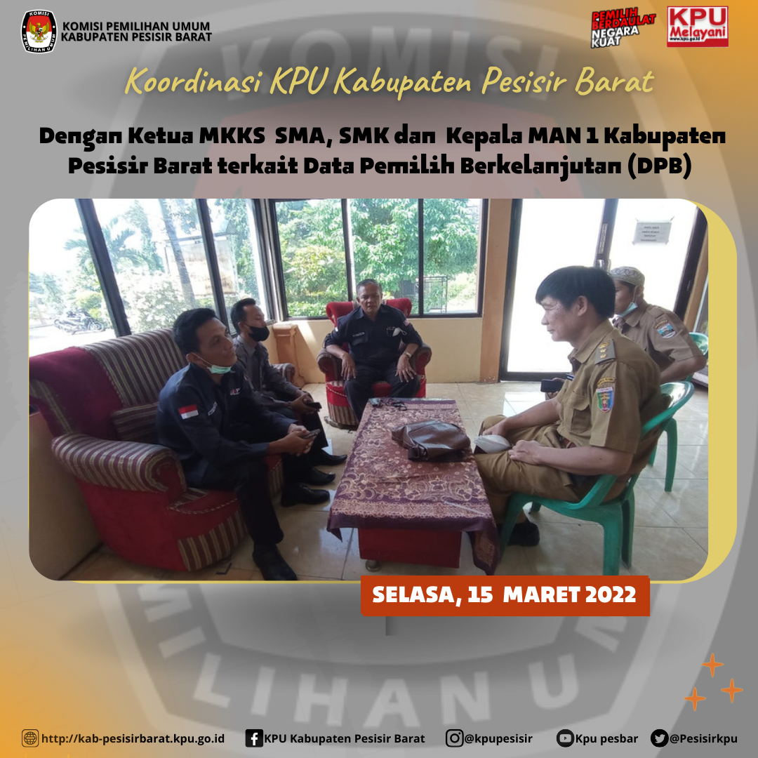 KPU Kabupaten Pesisir Barat pada Selasa (15/3) Anggota KPU Kabupaten Pesisir Barat Marten Efendi,A.Md Selaku Ketua Divisi Perencanaan, Data dan Informasi beserta Kasubbag Data Agus Syafiri, S.E dan Operator Fany Pratama Kusuma Yudha melakukan koordinasi dengan mendatangi Ketua MKKS SMA Pesisir Barat, Ketua MKKS SMK Pesisir Barat, dan Kepala Sekolah MAN 1 Pesisir Barat, dengan didampingi oleh Bawaslu Kabupaten Pesisir Barat terkait permintaan data seluruh siswa/i sebagai bahan pemutakhiran data pemilih berkelanjutan (DPB) guna melakukan pendataan untuk memastikan para siswa/i yang berpotensi mempunyai hak pilih khususnya para siswa/i di sekolah tersebut yang berdomisili di Kabupaten Pesisir Barat.