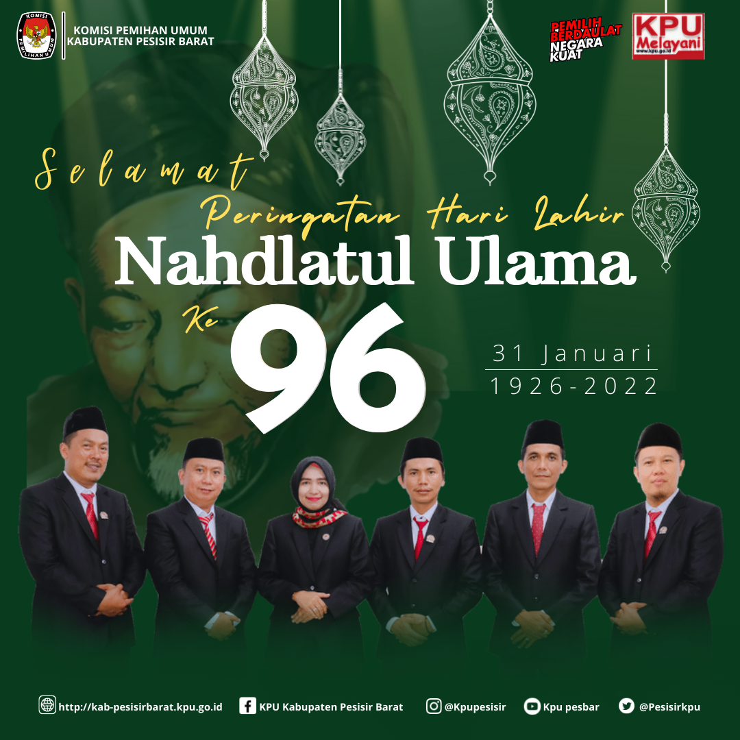 Segenap Jajaran KPU Kabupaten Pesisir Barat Mengucapkan Selamat Harlah Nahdatul Ulama Ke-96.Semoga selalu gigih memperjuangkan Islam yang moderat rahmatan lil alamin. Jaya dan sukses selalu, menuju Satu Abad NU.