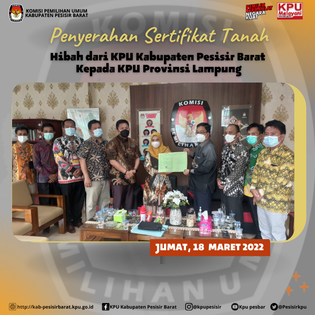 KPU Kabupaten Pesisir Barat pada Jum'at (18/03) menyerahkan Sertifikat Tanah Hibah KPU Kabupaten Pesisir Barat kepada KPU Provinsi Lampung.