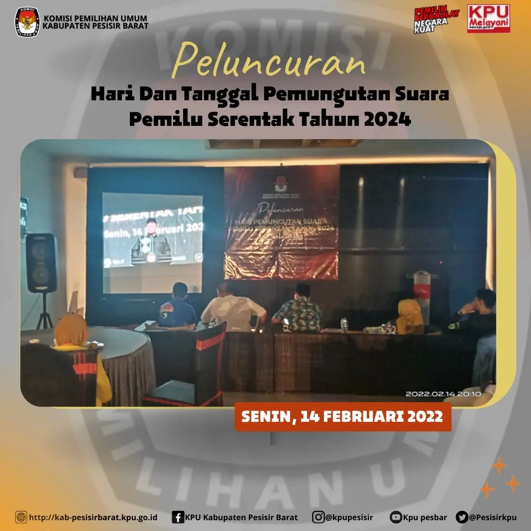 #TemanPemilih, KPU Kabupaten Pesisir Barat pada Senin 14 Februari 2022 pukul 19.00 WIB Mengikuti peluncuran Hari dan Tanggal Pemungutan Suara Pemilu Serentak Tahun 2024 yang akan dilaksankan pada Rabu, 14 Februari 2024.