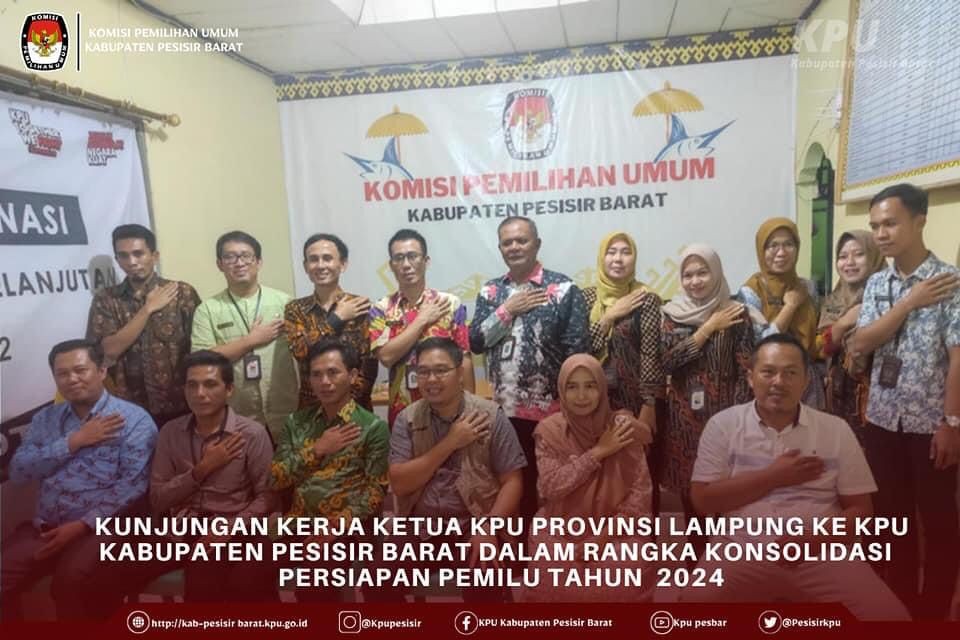 Komisi Pemilihan Umum Kabupaten Pesisir Barat menerima kunjungan Ketua KPU Provinsi Lampung Erwan Bustami, SH., MH. dalam rangka konsolidasi persipan tahapan Pemilu Tahun 2024 dan di sambut langsung oleh Ketua KPU Kabupaten Pesisir Barat Marlini, SH.i., MA dan Anggota KPU Zairi Opani, S.E., Ramzi, S.Pd.I., Marten Efendi, S.Kom. dan Sekretaris Donny Zulkarnaen, S. Pd. I. beserta jajaran Sekretariat KPU Kabupaten Pesisir Barat.