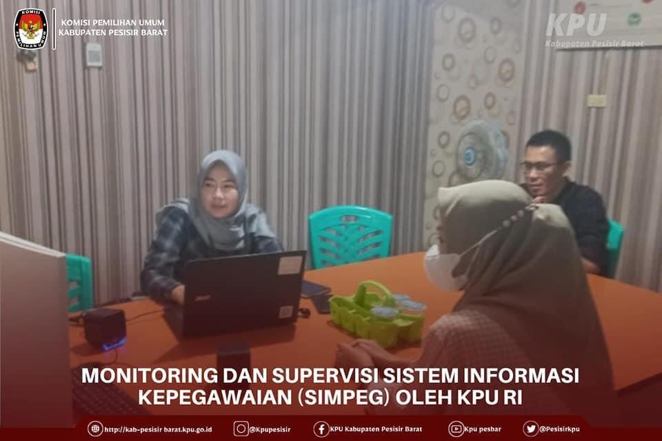 Kasubbag Hukum dan SDM Merah Gunawan,SH,.MM beserta Staf Sekretariat KPU Kabupaten Pesisir Barat mengikuti kegiatan monitoring dan Supervisi Sistem Informasi Kepegawaian (SIMPEG) yang dilaksanakan oleh KPU RI yang diikuti oleh KPU Provinsi Lampung dan Seluruh Kabupaten /Kota Se-Provinsi Lampung.