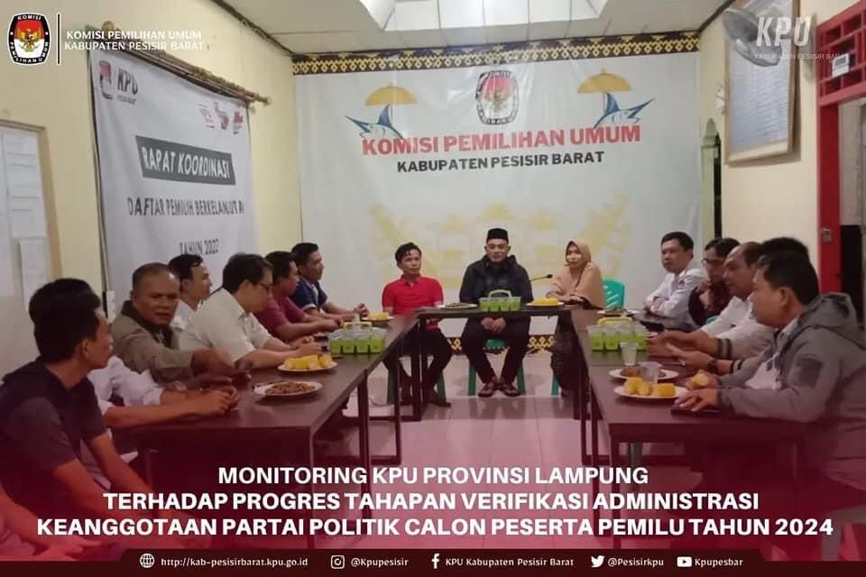 Kunjungan ini Juga Selain Memantau Progres Verifikasi Administrasi Keanggotaan Partai Politik Yang di laksanakan Oleh KPU Kabupaten Pesisir Barat Juga sebagai bentuk dukungan dan memberikan Semangat Oleh KPU Provinsi Lampung kepada KPU Kabupaten Pesisir Barat dalam melaksanakan tahapan Verifikasi Administrasi Keanggotaan Partai Politik Calon Peserta Pemilu Tahun 2024 yang sedang berlangsung.