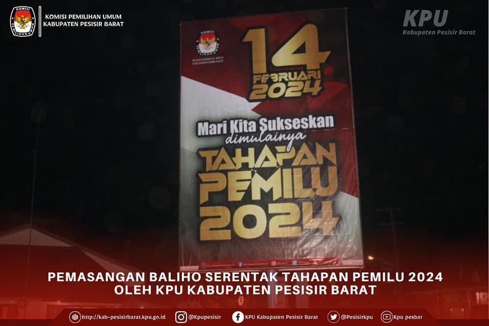 Dalam rangka Peluncuran Tahapan Pemilu 2024 KPU Kabupaten Pesisir Barat melakukan pemasangan Baliho Serentak yang dilaksanakan oleh KPU Kabupaten/ Kota Se - Provinsi Lampung dengan Tema " Mari Kita Sukseskan dimulainya Tahapan Pemilu 2024.