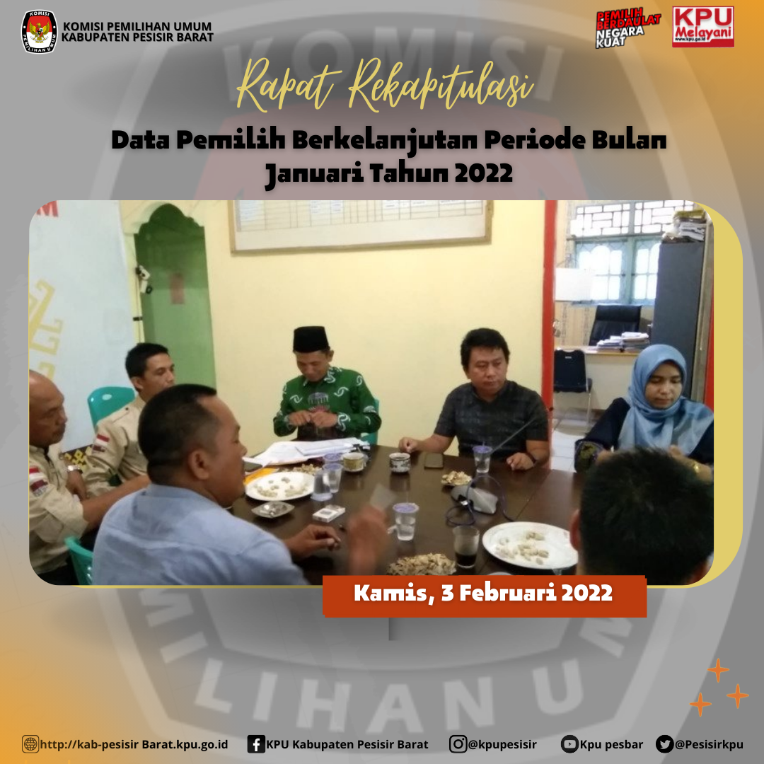 Kamis, tanggal 3 Februari 2022, bertempat di Aula Kantor KPU Kabupaten Pesisir Barat, Ketua dan Anggota KPU Kabupaten Pesisir Barat telah melaksanakan Rapat Rekapitulasi Data Pemilih Berkelanjutan (DPB) priode bulan Januari Tahun 2022. Didalam rapat tersebut diitetapkanlah jumlah data pemilih pada bulan berjalan sebanyak 108.756 (seratus depan ribu tujuh ratus lima puluh enam) pemilih, yang tersebar di 318 (tiga ratus delapan belas) TPS, 118 (seratus delapan belas) Desa/ Kelurahan , 11 (sebelas) Kecamatan di Kabupaten Pesisir Barat.