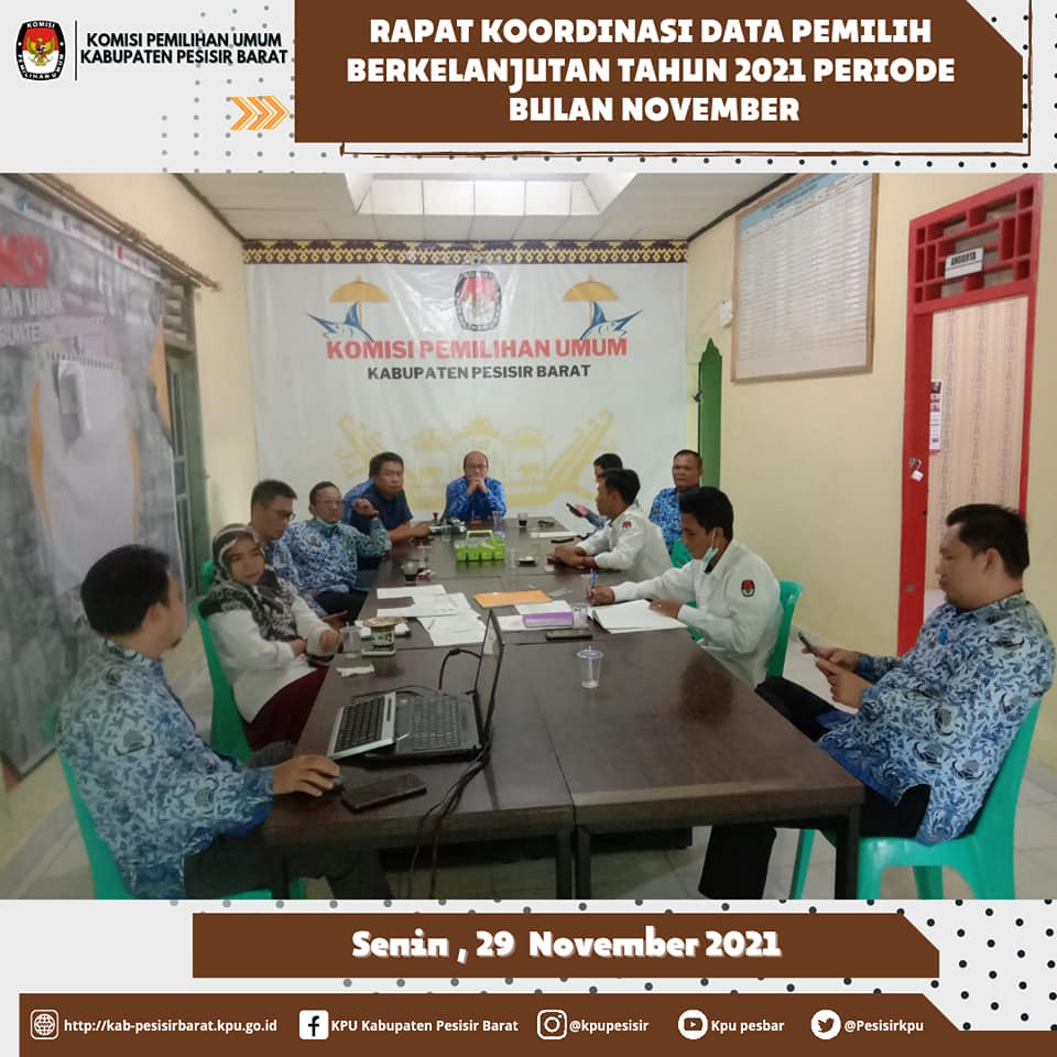 Pada hari Senin 29 November 2021 KPU Pesisir Barat telah melaksanakan Rapat Koordinasi Data Pemilih Berkelanjutan Bulan November Tahun 2021 sesuai dengan Surat Ketua KPU Republik Indonesia Nomor 366/PL.02-SD/01/KPU/IV/2021 Tanggal 21 April 2021.