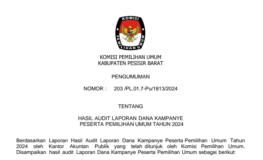 Berikut di sampaikan Pengumuman Nomor : 203/PL.01.7-Pu/1813/2024 Tentang Laporan Hasil Audit Laporan Dana Kampanye Peserta Pemilihan Umum Tahun 2024.
