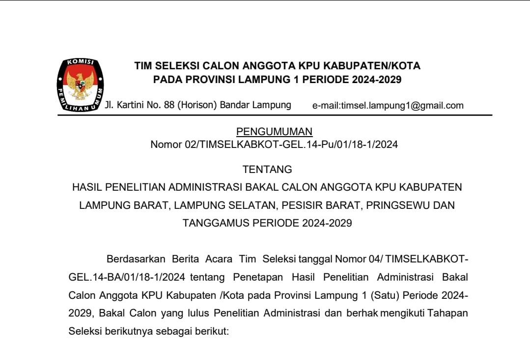 Berikut disampaikan Pengumuman Hasil Penelitian Administrasi Bakal Calon Anggota KPU Kabupaten Pesisir Barat Periode 2024-2029