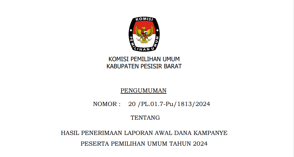 Krui, kab-pesisirbarat.kpu.go.id – Teman Pemilih, pasca tahapan penyampaian Laporan Awal Dana Kampanye (LADK) yang berakhir pada Minggu (07/01) serta tahapan penerimaan pelaporan LADK Perbaikan yang rampung pada Jumat (12/01), KPU Kabupaten Pesisir Barat mengumumkan hasil penerimaan LADK Peserta Pemilu Tahun 2024 melalui pengumuman Nomor: 20/PL.01.7-Pu/1813/2024 pada Sabtu (13/01).