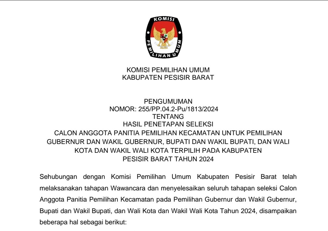 Berikut disampaikan Pengumuman Nomor : 255/PP.04.2-Pu/1813/2024 Tentang Hasil Penetapan Seleksi Calon Panitia Pemilihan Kecamatan (PPK) Untuk Pemilihan Gubernur dan Wakil Gubernur, Bupati dan Wakil Bupati, dan Walikota dan Wakil Walikota Terpilih Pada Kabupaten Pesisir Barat Tahun 2024.