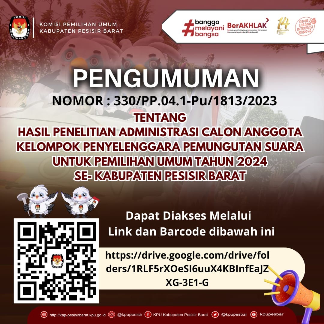 Pengumuman Hasil Seleksi Administrasi Calon Anggota Kelompok Penyelenggara Pemungutan Suara (KPPS) Pemilu Tahun 2024 KPU Kabupaten Pesisir Barat