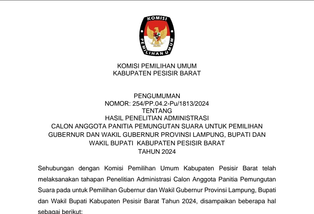 Berikut di sampaikan Pengumuman Nomor : 254/PP.04.2-Pu/1813/2024 Tentang Hasil Penelitian Administrasi Calon Panitia Pemungutan Suara Untuk Pemilihan Gubernur dan Wakil Gubernur Provinsi Lampung, Bupati dan Wakil Bupati Kabupaten Pesisir Barat Tahun 2024.