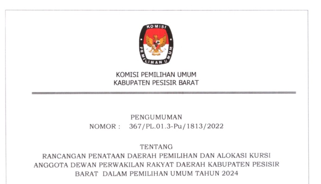 PENGUMUMAN NOMOR : 367/PL.01.3-Pu/1813/2022 TENTANG RANCANGAN PENATAAN DAPIL DAN ALOKASI KURSI ANGGOTA DPRD KABUPATEN PESISIR BARAT DALAM PEMILIHAN UMUM TAHUN 2024