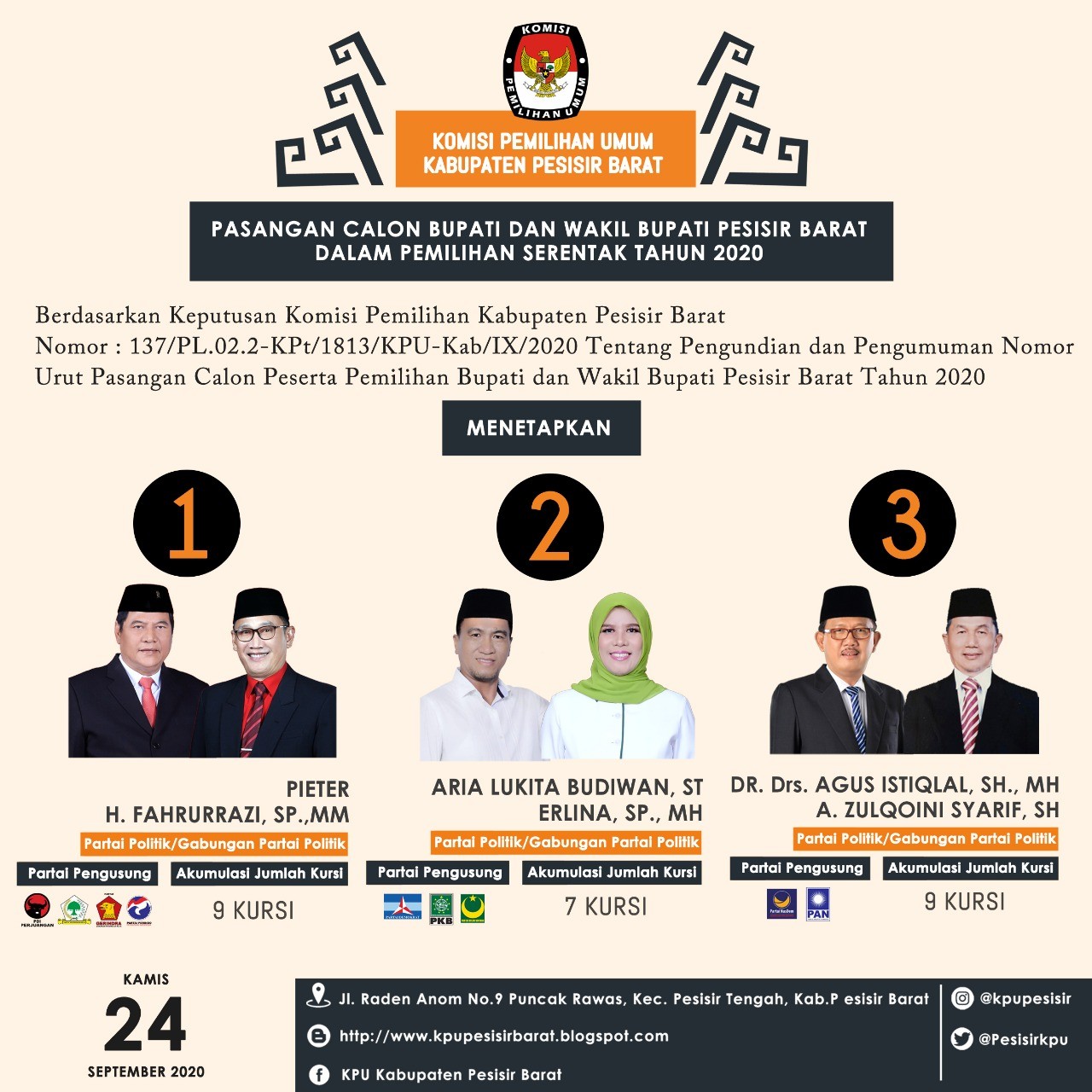 KPU Kab. Pesisir Barat telah melaksanakan Rapat Pleno Terbuka Pengundian dan Penetapan Nomor Urut Pasangan Calon pada Pemilihan Bupati dan Wakil Bupati Pesisir Barat Tahun 2020 pada tanggal 24 September 2020 yang tertuang dalam Berita Acara Komisi Pemilihan Umum Kabupaten Pesisir Barat Nomor 54/PL.02.2-BA/1813/KPU-Kab/IX/2020 tentang Pengundian dan Pengumuman Nomor Urut Pasangan Calon pada Pemilihan Bupati dan Wakil Bupati Pesisir Barat Tahun 2020. Dengan ini kami bermaksud mengumumkan nomor urut masing-masing Pasangan Calon yang telah ditetapkan, sebagaimana yang tercantum dalam Pengumuman berikut:
