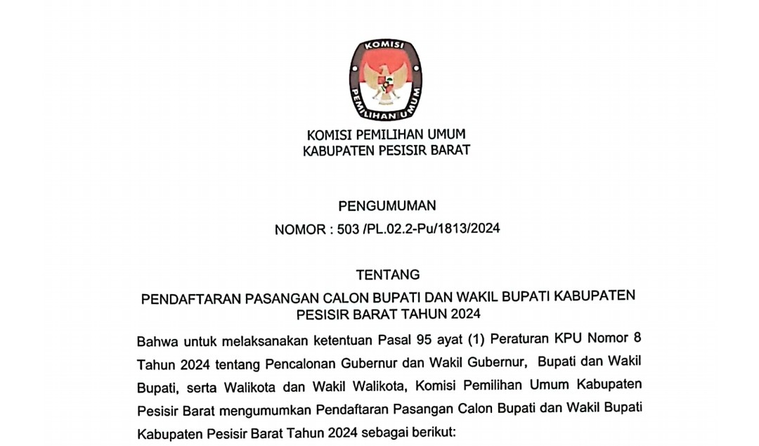 Pengumuman Pendaftaran Pasangan Calon Bupati dan Wakil Bupati Kabupaten Pesisir Barat Tahun 2024