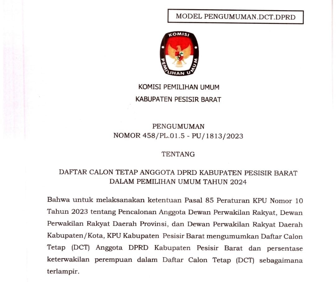 Berikut di sampaikan Pengumuman Nomor 458/PL.01.5-PU/1813/2023 Tentang Daftar Calon Tetap Anggota DPRD Kabupaten Pesisir Barat Dalam Pemilihan Umum Tahun 2024.