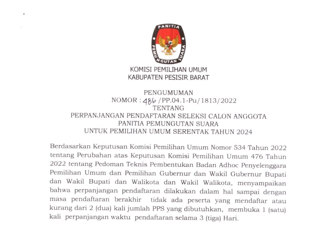Berdasarkan Pengumuman Nomor 486/PP.04.1-Pu/1813/2022 Tentang Perpanjangan Pendaftaran Seleksi Calon Anggota Panitia Pemungutan Suara Untuk Pemilihan Umum Serentak Tahun 2024.