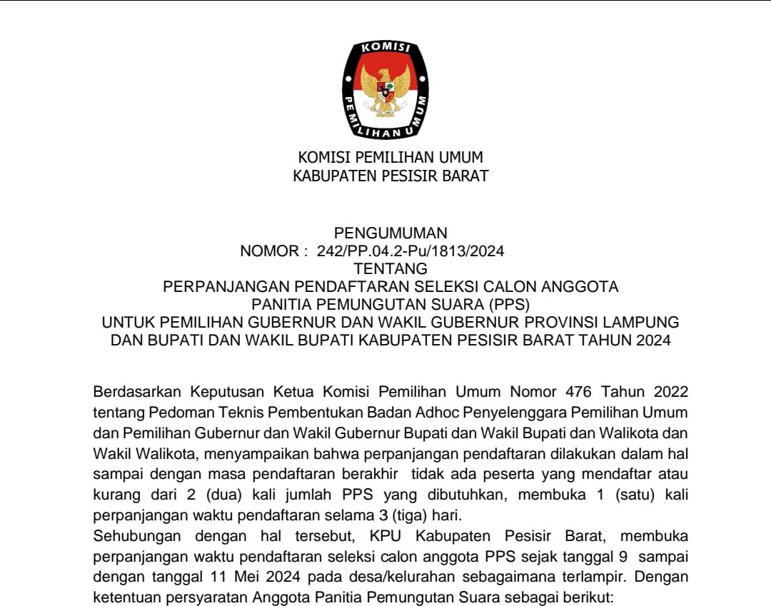 Berikut disampaikan Pengumuman Nomor: 242/PP.04-2-Pu/1813/2024 Tentang Perpanjangan Pendaftaran Seleksi Calon Anggota Panitia Pemungutan Suara (PPS) Untuk Pemilihan Gubernur dan Wakil Gubernur Provinsi Lampung, Serta Bupati dan Wakil Bupati Kabupaten Pesisir Barat Tahun 2024