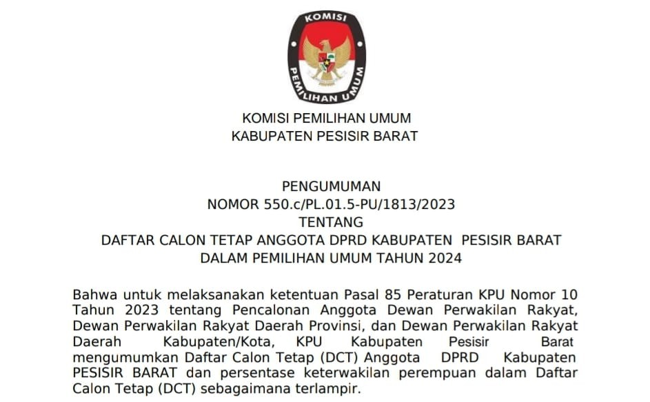 Pengumuman Perubahan Daftar Calon Tetap Calon Anggota DPRD Kabupaten Pesisir Barat Untuk Pemilu Tahun 2024