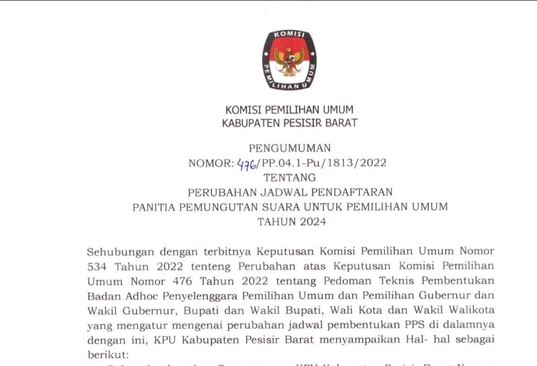 Berikut di sampaikan Pengumuman Nomor: 476/PP.04.1-Pu/1813/2022 Tentang Perubahan Jadwal Pendaftaran Panitia Pemungutan Suara Untuk Pemilihan Umum Tahun 2024.