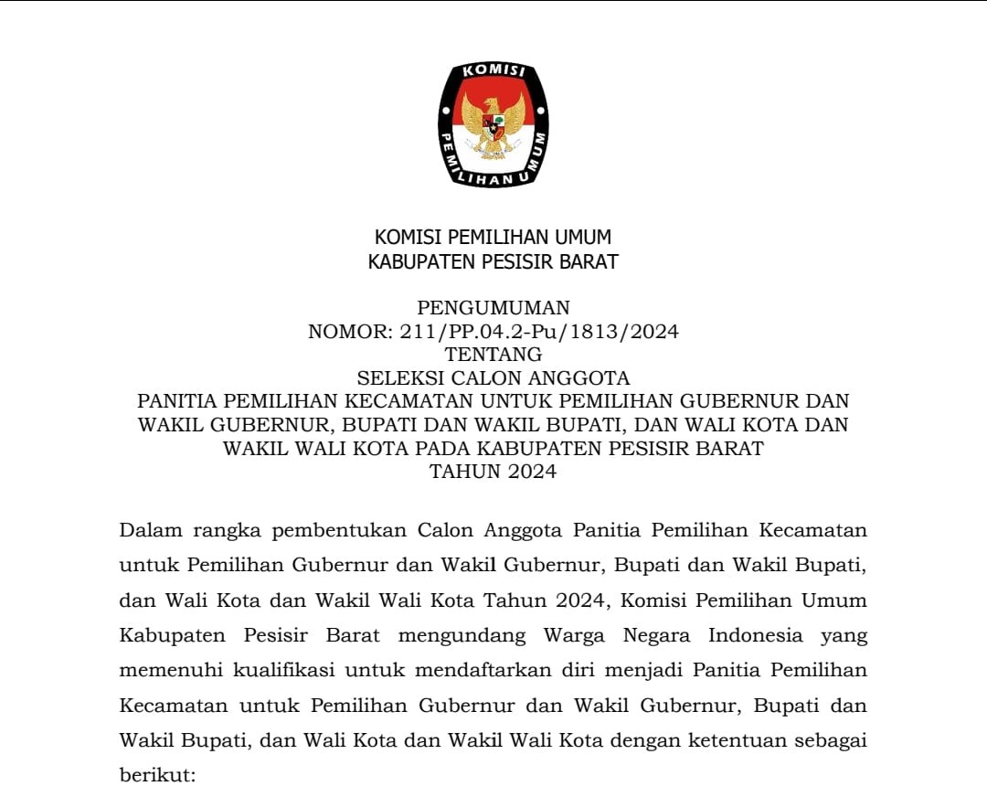 Berikut disampaikan Pengumuman Nomor: 211/PP.04-2-Pu/1813/2024 tentang Seleksi Calon Anggota Panitia Pemilihan Kecamatan Untuk Pemilihan Gubernur dan Wakil Gubernur, Bupati dan Wakil Bupati serta Walikota dan Wakil Walikota Pada Kabupaten Pesisir Barat tahun 2024.