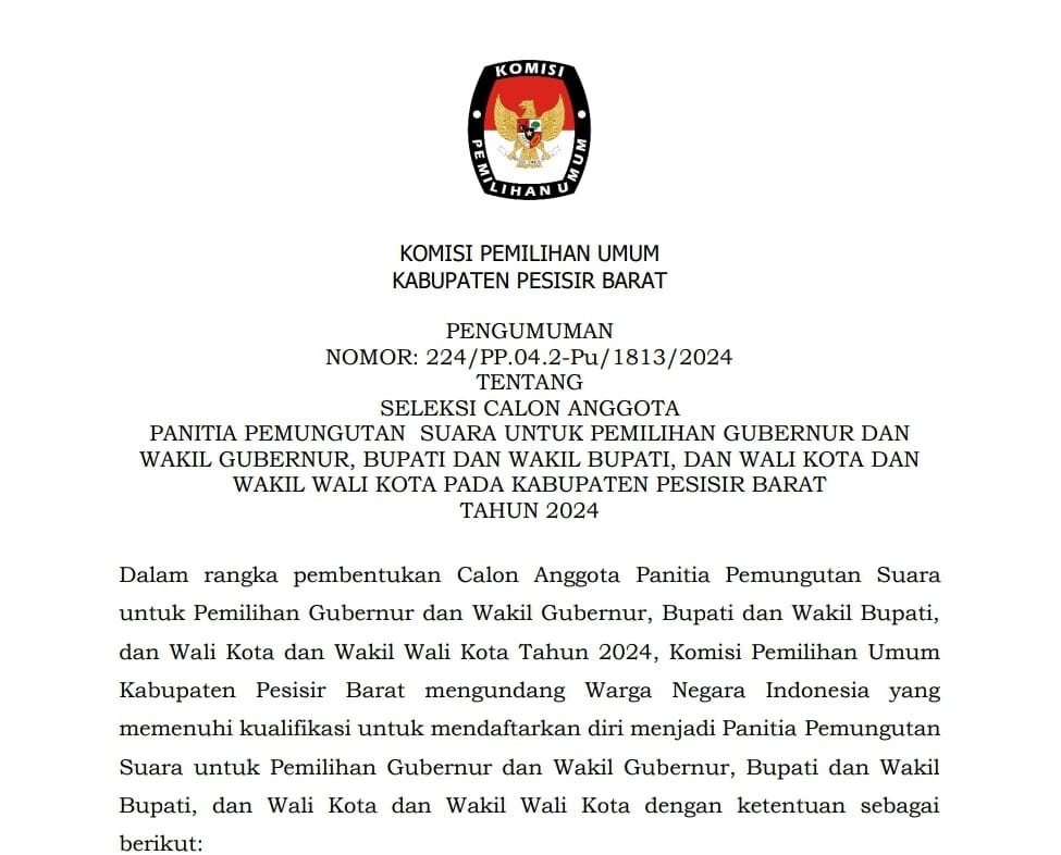 Berikut disampaikan Pengumuman Nomor : 224/PP.04.2-Pu/1813/2024 Tentang Seleksi Calon Anggota Panitia Pemungutan Suara Untuk Pemilihan Gubernur dan Wakil Gubernur, Bupati dan Wakil Bupati, dan Walikota dan Wakil Walikota dan Wakil Walikota Pada Kabupaten Pesisir Barat Tahun 2024.