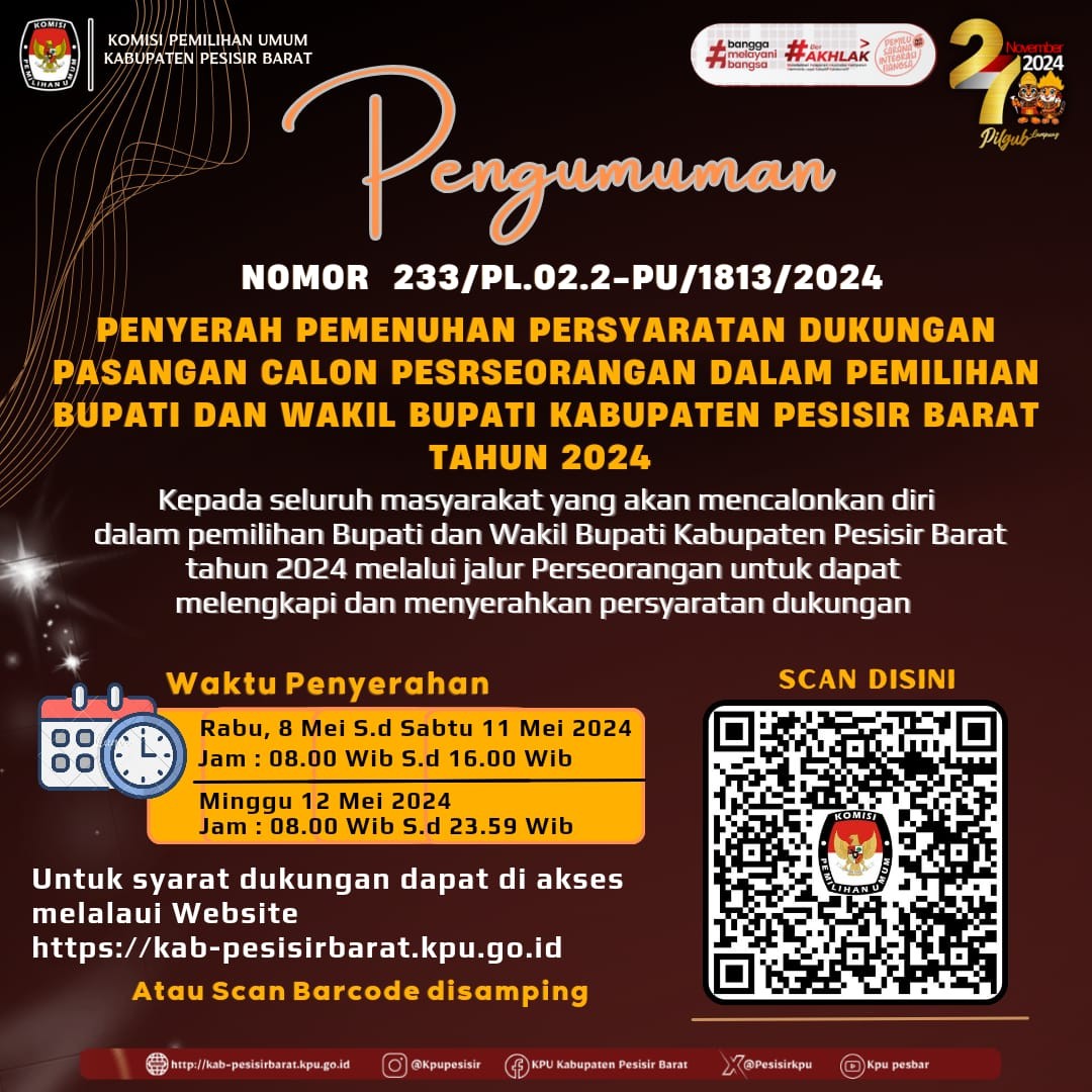 PENGUMUMAN TENTANG PENYERAHAN PEMENUHAN PERSYARATAN DUKUNGAN PASANGAN CALON PERSEORANGAN DALAM PEMILIHAN BUPATI DAN WAKIL BUPATI KABUPATEN PESISIR BARAT TAHUN 2024
