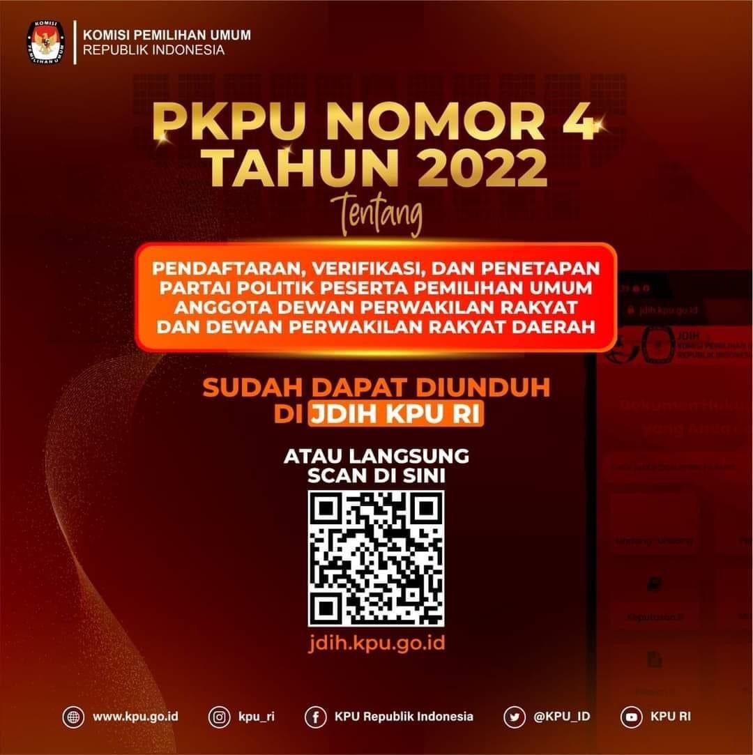 #Repost KPU Republik Indonesia #TemanPemilih, kamu perlu tahu Peraturan KPU Nomor 4 Tahun 2022 tentang Pendaftaran, Verifikasi dan Penetapan Partai Politik Peserta Pemilihan Umum Anggota Dewan Perwakilan Rakyat dan Dewan Perwakilan Rakyat Daerah telah diundangkan dan dapat diunduh di JDIH KPU RI..