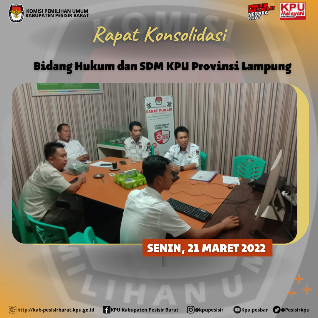 KPU Kabupaten Pesisir Barat Pada hari Senin, (21/3) Anggota KPU Divisi Hukum dan Pengawasan Azwan Feri,S.Hut dan Ketua Divisi Parmas dan SDM Zairi Opani,SE, Sekretaris Donny Zulkarnaen, S.Pd.I beserta Kasubbag Hukum dan SDM Merah Gunawan,SH.,MM dan Staf Mengikuti Rapat Konsolidasi Bidang Hukum dan SDM KPU Kabupaten /Kota se- Provinsi Lampung yang di selenggarakan oleh KPU Provinsi Lampung Secara Daring Zoom.