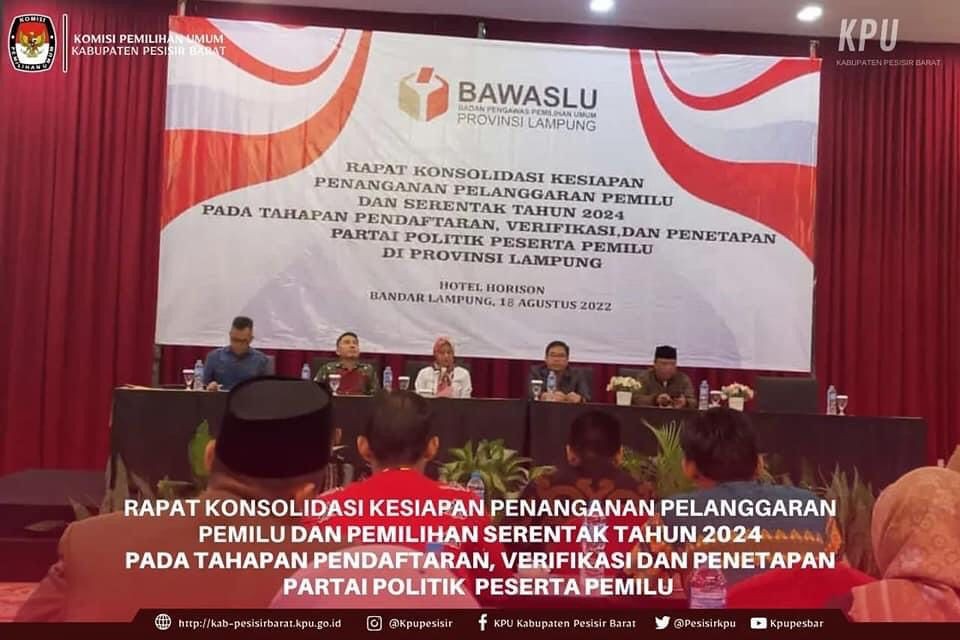 Anggota Komisi Pemilihan Umum Kabupaten Pesisir Barat Div. Hukum dan Pengawasan,Azwan Feri.,S.Hut. mengikuti kegiatan Rapat Konsolidasi Kesiapan Penanganan Pelanggaran Pemilu Dan Pemilihan Serentak Tahun 2024 Pada Tahapan Pendaftaran, Verifikasi, Dan Penetapan Partai Politik Peserta Pemilu Di Provinsi Lampung yang diselenggarakan oleh Badan Pengawas Pemilu (BAWASLU) Provinsi Lampung di Hotel Horison Bandar Lampung, Kamis (18/08/22).