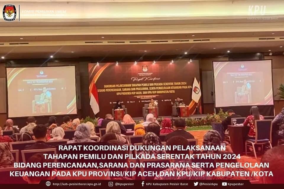 Anggota KPU Kabupaten Pesisir Barat Div. Sosialisasi,Pendidikan Pemilih, Partisipasi Masyarakat dan SDM, Zairi Opani.,S.E, Anggota KPU Div.Perencanaan,Data dan Informasi,Marten Efendi.,S.Kom beserta Kasubbag Perencanaan, Data dan Informasi ,Agus Safari.,S.E ,Kasubbag Keuangan,Umum dan Logistik, Sujarwo Saidi.,S.I.P.,MM Mengikuti Rapat Koordinasi dukungan Pelaksanaan Tahapan Pemilu Dan Pilkada Serentak Tahun 2024 Bidang Perencanaan, Sarana Dan Prasarana Serta Pengelolaan Keuangan pada Kpu Provinsi/Kip Aceh Dan Kpu Kabupaten/Kota Se-Indonesia secara luring yang dilaksanakan oleh KPU RI pada tanggal 23 - 25 Agustus 2022 di Bali Nusa Dua Hotel.