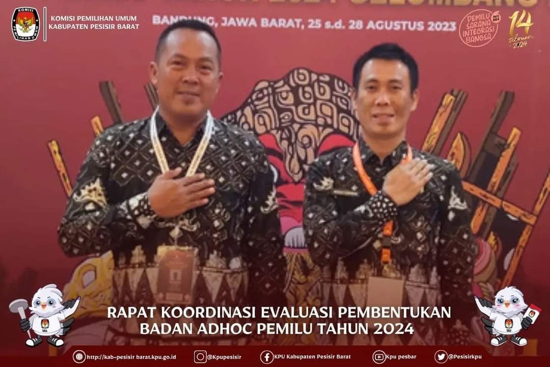 Ketua Divisi Sosialisasi Pendidikan Pemilih, Partisipasi Masyarakat, dan Sumber Daya Manusia KPU Kabupaten Pesisir Barat Zairi Opani, SE didampingi Kasubbag Hukum dan SDM Merah Gunawan, S.H., M.M mengikuti kegiatan Rapat Koordinasi Evaluasi Pembentukan Badan Adhoc Pemilu Tahun 2024 Gelombang III yang diselenggarakan oleh KPU Republik Indonesia di Harris Hotel & Conventions Festival Citylink Bandung, 25 s.d 28 Agustus 2023.