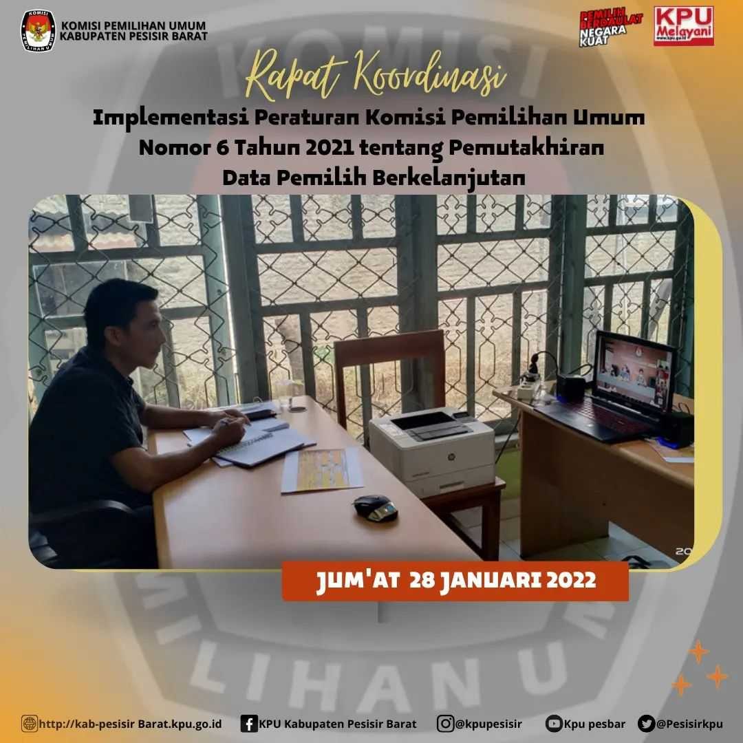 #TemanPemilih , Komisi Pemilihan Umum Kabupaten Pesisir Barat Barat pada Jumat (28/1) Anggota KPU Kabupaten Pesisir Barat Divisi Perencanaan data dan Informasi Marten Efendi,A.Md dan Admin Sidalih mengikuti Rapat Koordinasi Implementasi Peraturan Komisi Pemilihan Umum Nomor 06 Tahun 2021 tentang Pemutakhiran Data Pemilih Berkelanjutan yang diselenggarakan oleh KPU Provinsi Lampung secara Luring dan daring melalui zoom meeting dengan peserta 15 KPU Kabupaten/Kota Se - Provinsi Lampung.Kegiatan dibuka langsung oleh Ketua KPU Provinsi Lampung Erwan Bustami,SH,. MH