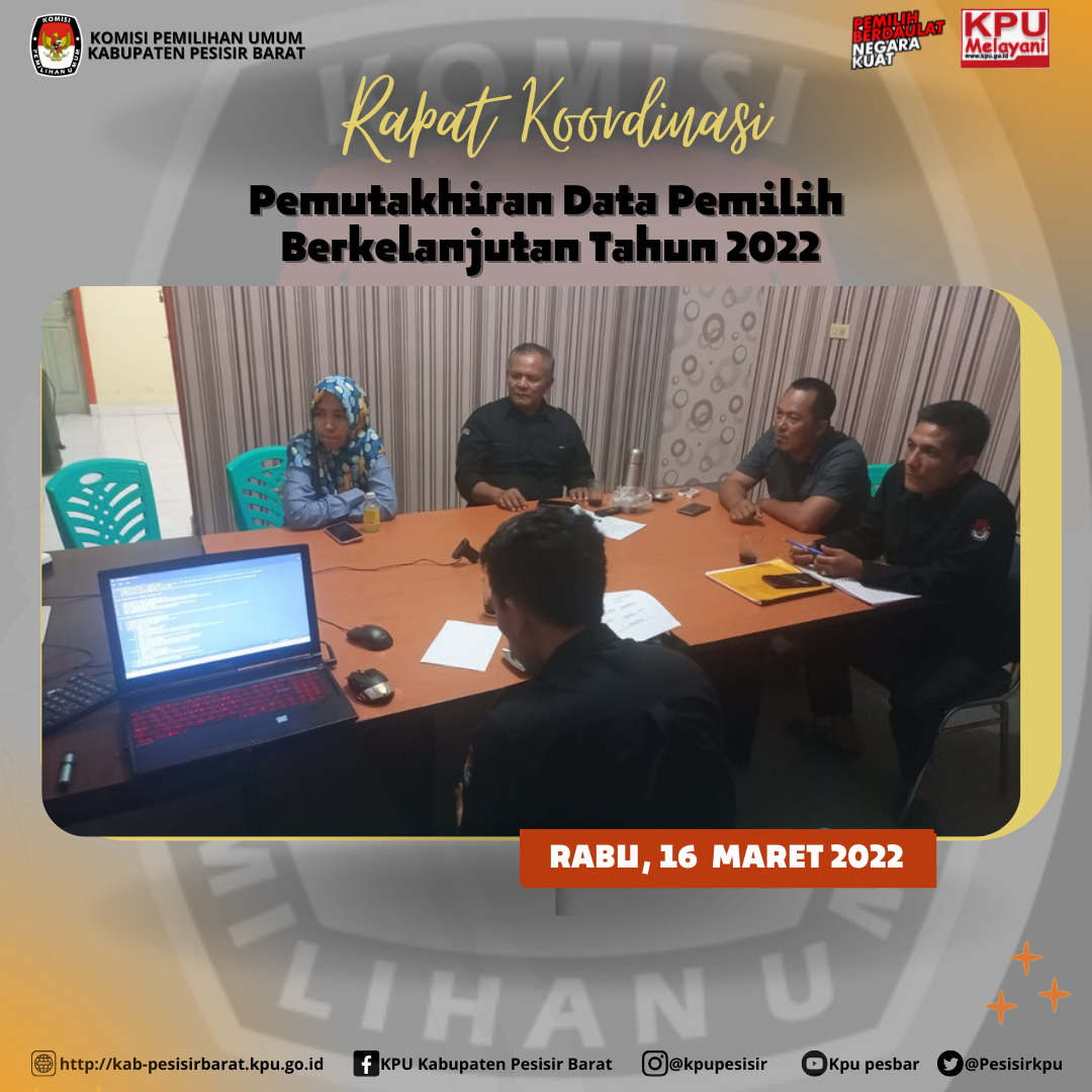 KPU Kabupaten Pesisir Barat pada Rabu Pukul 13.00 WIB (16/03) Ketua dan Anggota KPU Kabupaten Pesisir Barat, Kasubbag Perencanaan Data dan Informasi beserta Operator mengikuti Rapat Koordinasi Pemutakhiran Data Pemilih Berkelanjutan Tahun 2022 yang diselenggarakan oleh Divisi Data dan Informasi KPU Provinsi Lampung secara Daring Zoom Meeting. Kegiatan di Ikuti oleh Seluruh Satker 15 KPU Kabupaten/ Kota Se - Provinsi Lampung.