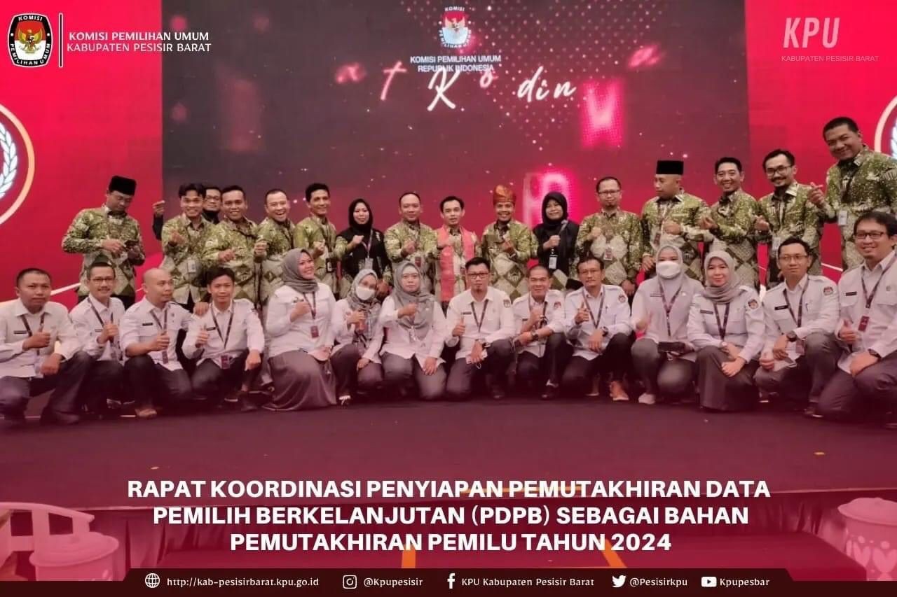Kamis, 22 September 2022 Komisi Pemilihan Umum Kabupaten Pesisir Barat Mengukiti Rapat Koordinasi Penyiapan Data Pemutakhiran Data Pemilih Berkelanjutan (PDPB) Sebagai Bahan Pemutakhiran Pemilu Tahun 2024 yang diselenggarakan oleh KPU Republik Indonesia di Hotel Santika Premiere Dyandra Hotel & Convention, Medan, Sumatera Utara 22 s.d 24 September 2022.
