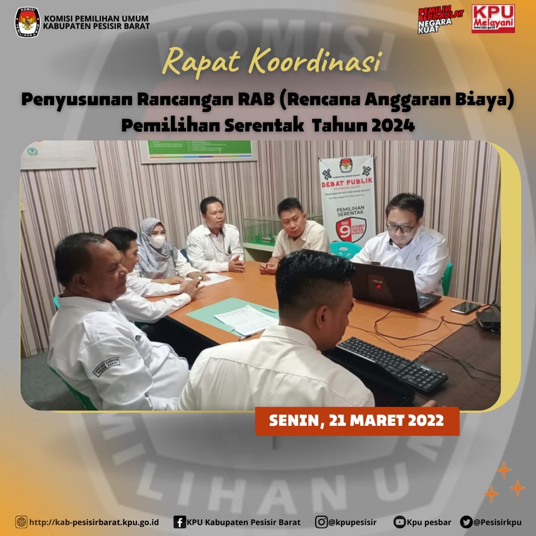 KPU Kabupaten Pesisir Barat Pada hari Senin, (21/3) Ketua dan Anggota KPU, Sekretaris, beserta Kasubbag Perencanaan Data dan Informasi beserta staf, mengikuti Rapat Koordinasi Penyusunan RAB Pemilihan Serentak Tahun 2024, yang dilaksanakan oleh KPU Provinsi Lampung secara secara daring. Kegiatan di buka langsung oleh Ketua KPU Provinsi Lampung (Erwan Bustami, SH., MH.) dan di ikuti oleh seluruh KPU di 15 Kab/Kota se Provinsi Lampung.